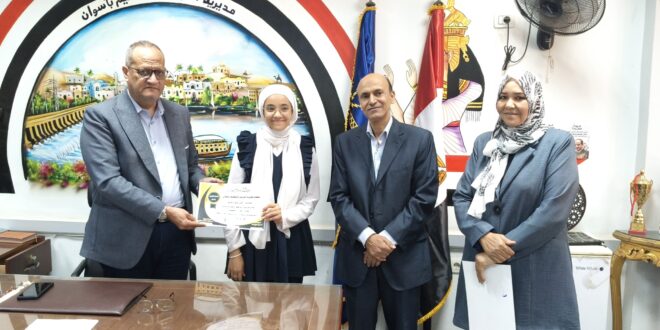 وقام السيد وكيل الوزارة بحثهم على إبراز قدراتهم والتمثيل المشرف لطلاب أسوان ، وكرمهم بتسليم شهادات تقدير لهم ، متمنياً لهم كل التوفيق ،وهم (ريتال أحمد محمود مدرسة عمر بن عبدالعزيز الابتدائية بإدارة كوم امبو التعليمية – جنى عصام حسن مدرسة عزيز ابراهيم الاعدادية بنات- الزهراء مصطفى حسن مدرسة ادفو الثانوية الصناعية بنات)