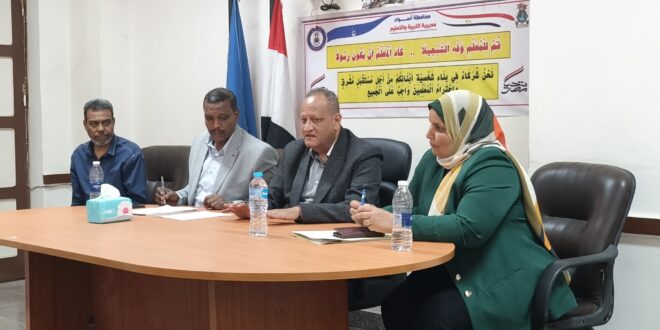 فى ضوء توجيهات السيد/ محمد عبد اللطيف وزير التربية والتعليم والتعليم الفنى، وا.د /اسماعيل كمال محافظ أسوان ، اجتمع ا/محمود بدوى وكيل وزارة التربية والتعليم بأسوان ، اليوم ، بالسادة رؤساء الأقسام وأعضاء التعليم الإعدادى بالإدارات التعليمية الخمس بحضور ا/فيصل نعيم مدير عام التعليم العام وا/هيام جلال مدير إدارة التعليم الإعدادى ، لمتابعة انتظام العملية التعليمية والاستعدادات لامتحانات نهاية العام لمراحل النقل والشهادة الإعدادية.