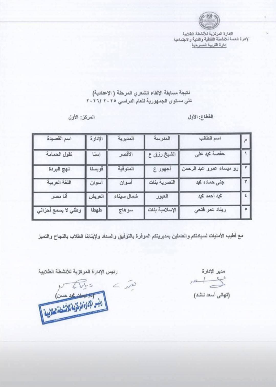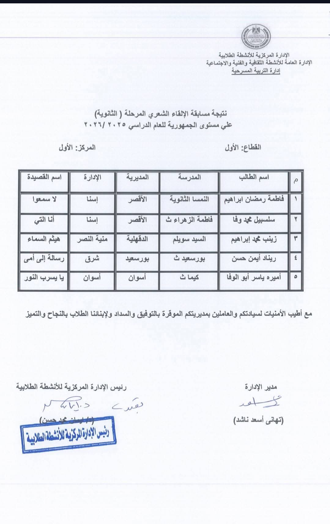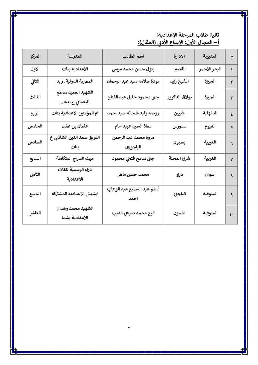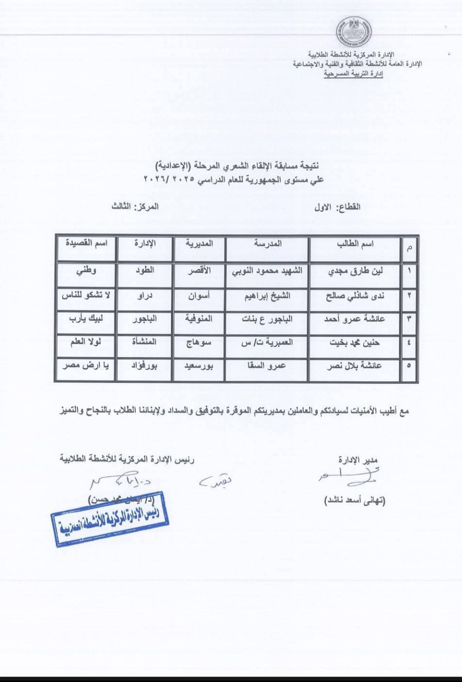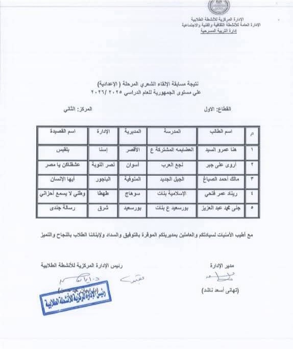 توجيه المسرح الطالبة جنى حمادة محمد مدرسة الناصرية بنات الإعدادية لفوزها بالمركز الأول على مستوى الجمهورية فى مسابقة " الإلقاء الشعري " الطالبة أميرة ياسر أبو الوفا المركز الأول جمهوريا مدرسة كيما الثانوية فى مسابقة " الإلقاء الشعري " توجيه الصحافة المركز الثاني جمهوريا لمدرسة النور للمكفوفين فى الإذاعة المدرسية للتربية الخاصة مدرسة سعاد ماهر الفندقية لفوزها بالمركز الخامس جمهوريا