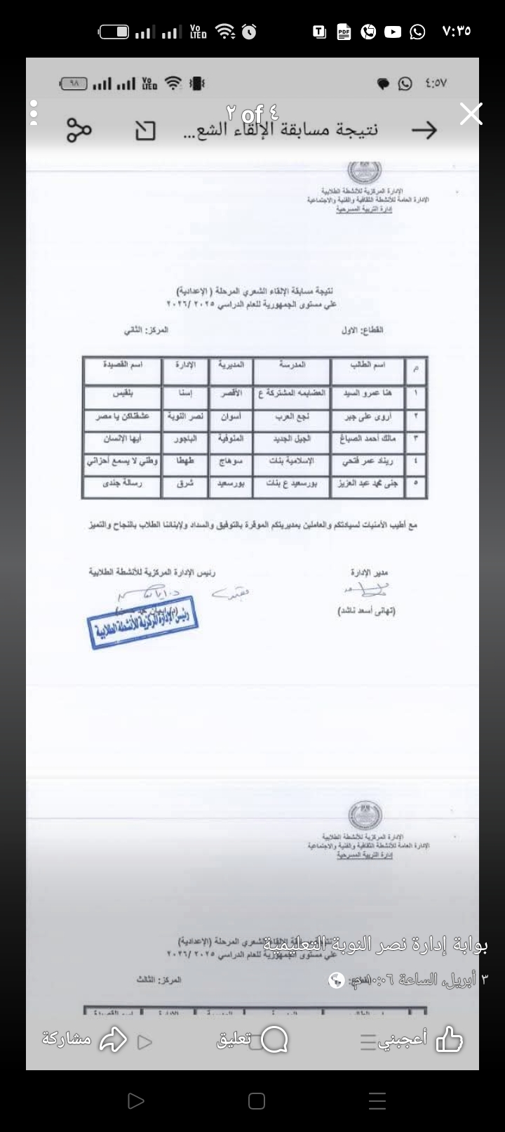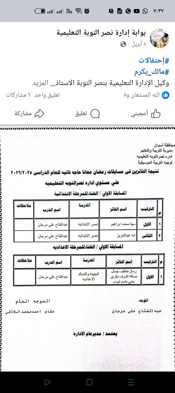 #إحتفالات #مالك_يكرم وكيل الإدارة التعليمية بنصر النوبة الاستاذ #يوسف_مالك ينوب الاستاذ #سيد_برجاس مدير عام الإدارة التعليمية بنصر النوبة الاحد٥ابريل ٢٠٢٦ ✨🌙 رمضان معانا حاجة تانية 🌙✨ 📚 مسابقة المديرية والجمهورية – المرحلة الإعدادية والابتدائية2026 📚 في أجواء مليانة روحانيات شهر رمضان الكريم، كان لطلابنا موعد مع التميز والإبداع، حيث شاركت #مدرسة_الجنينةوالشباك_الاعداديه #مدرسة_نصر_الإبتدائية في مسابقة المديرية و الجمهورية للمرحلة الإعدادية والابتدائية تحت شعار "رمضان معانا حاجة تانية" للعام الدراسي 2026. 💫 أبدع أبناؤنا الطلاب وقدموا نموذجًا مشرفًا يعكس روح التعاون والاجتهاد، مؤكدين أن رمضان مش بس عبادة، لكنه كمان شهر النجاح والتفوق وصناعة الإنجازات. 👏 كل الشكر والتقدير لـ الأستاذ #عبد_الفتاح_مرجان توجيه التربية الموسيقية بالإدارة التعليمية على جهودكم الكبيرة ودعمكم المستمر للطلاب، والتي كان لها دور أساسي في الوصول لهذا المستوى المشرف. 🌟 فخورين بطلابنا، ومستمرين دايمًا نحو القمة بإذن الله.