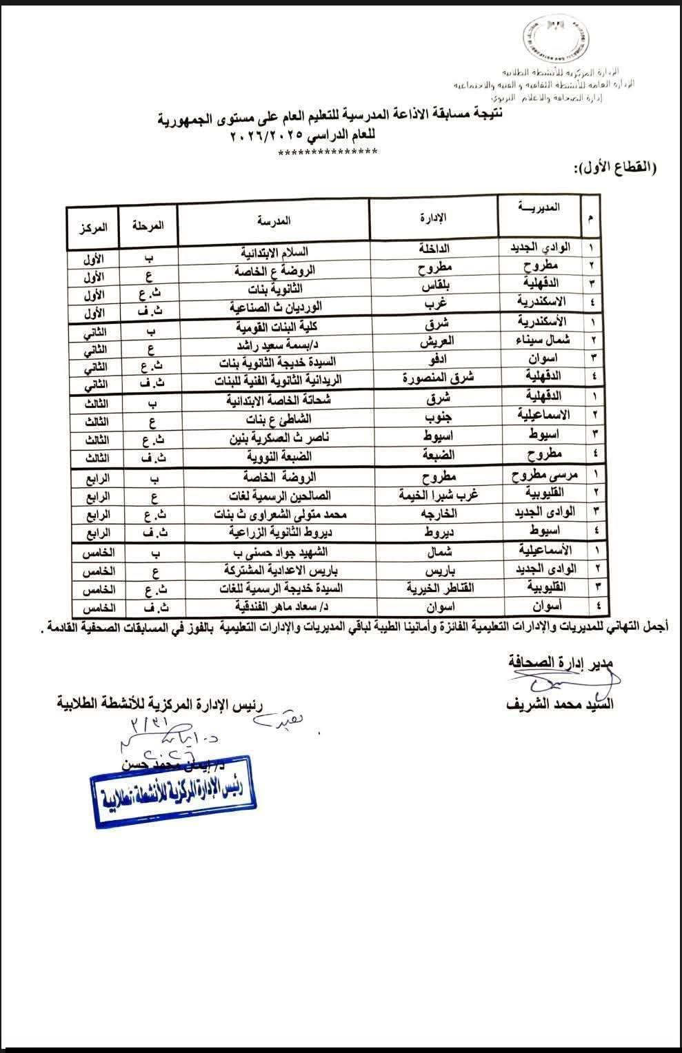 (توجيه الصحافه ) ٥_ يوم الخميس الموافق ٢ ابريل ٢٠٢٦ فوز مدرسة السيدة خديجة الثانوية بالمركز الثانى على مستوى الجمهورية فى مسابقة الاذاعة.