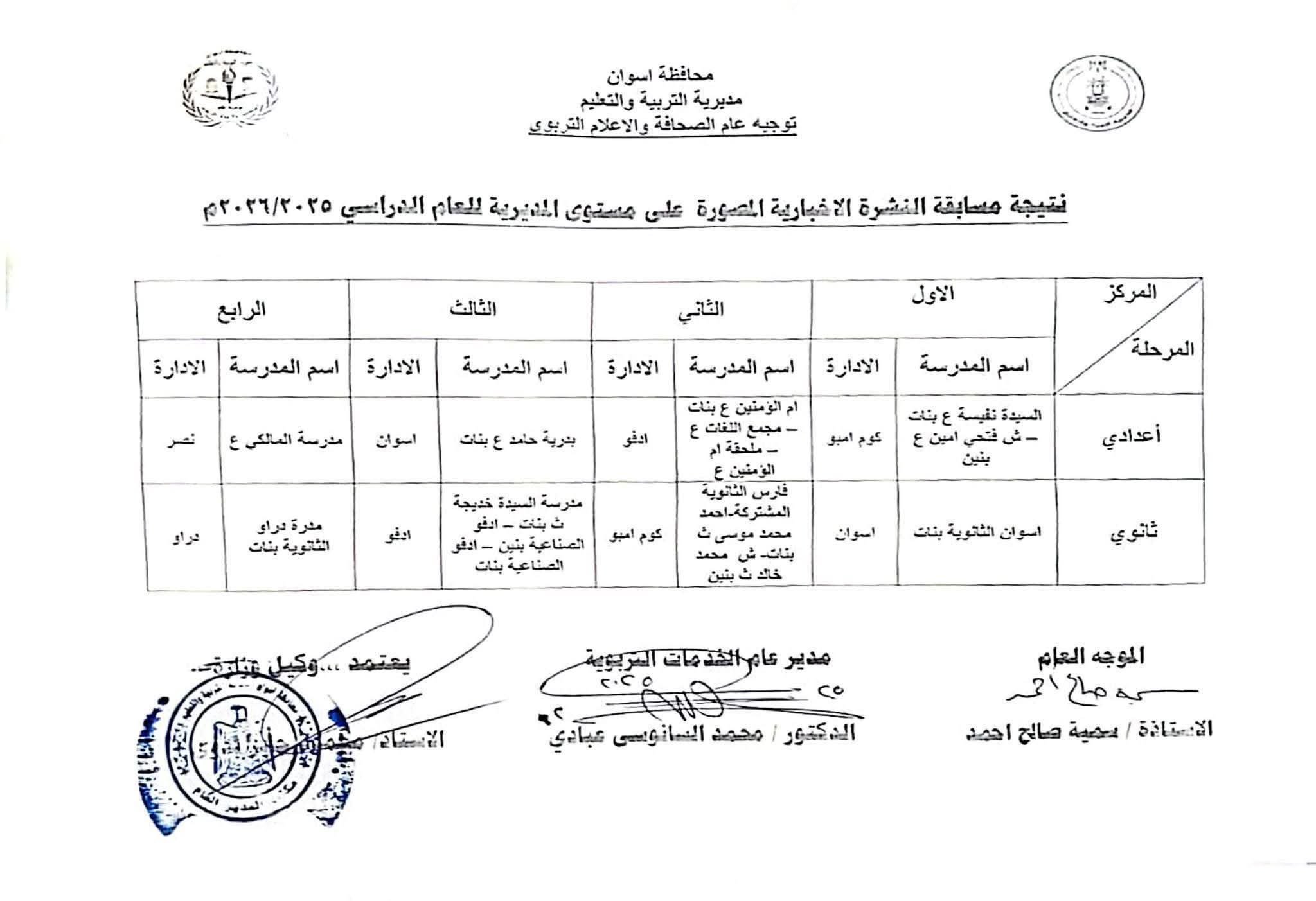 وتتوالى الانجازات لحصد المراكز علي مستوي المديرية في مسابقة النشرة الإخبارية المصورة للمرحلة الثانوية حيث تحقق الحصول علي المركز الثالث علي مستوي المديرية لثلاث مدارس بالمرحلة الثانوية ١- مدرسة السيدة خديجة الثانوية للبنات ٢- مدرسة ادفو الصناعية بنين ٣- مدرسة ادفو الصناعية بنات