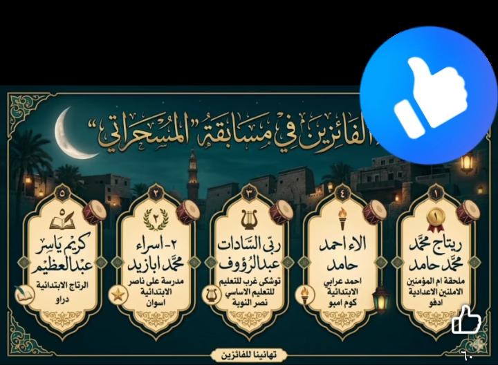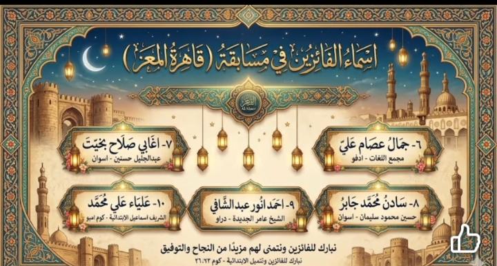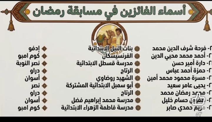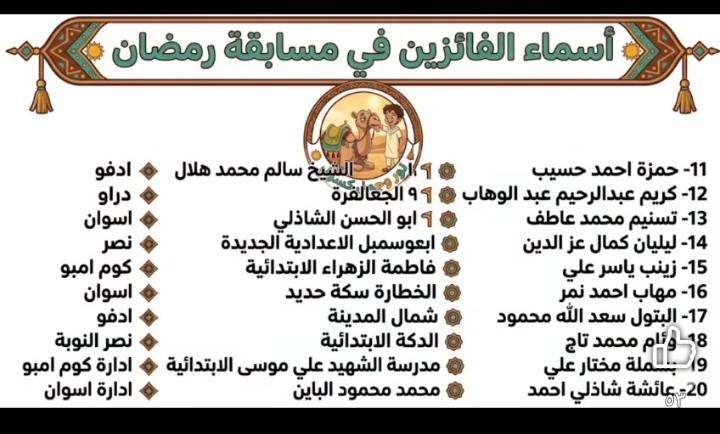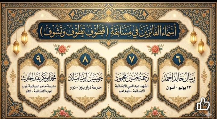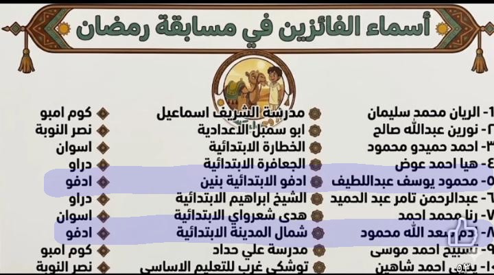 فوز عدد من طلاب مدارس الادرة في المسابقة الرمضانية الكبرى نساء وعلامات رمضان 2026 ( عبد الرازق طه- محمد دمرداش – مجمع ابو الريش بحري – انس الوجود – احمد طه حسين - عوض السيد الثانوية بنات - مجمع الحصايا ) .