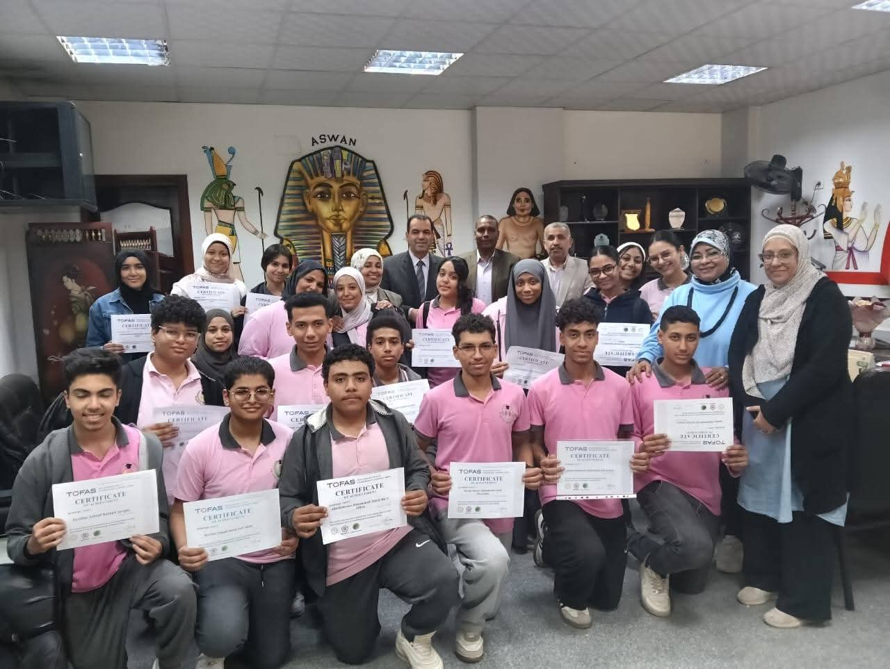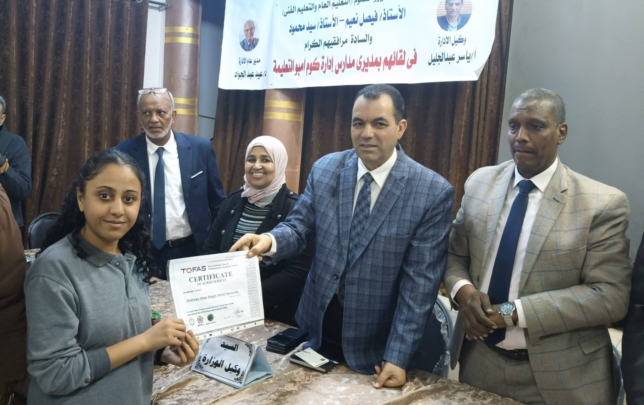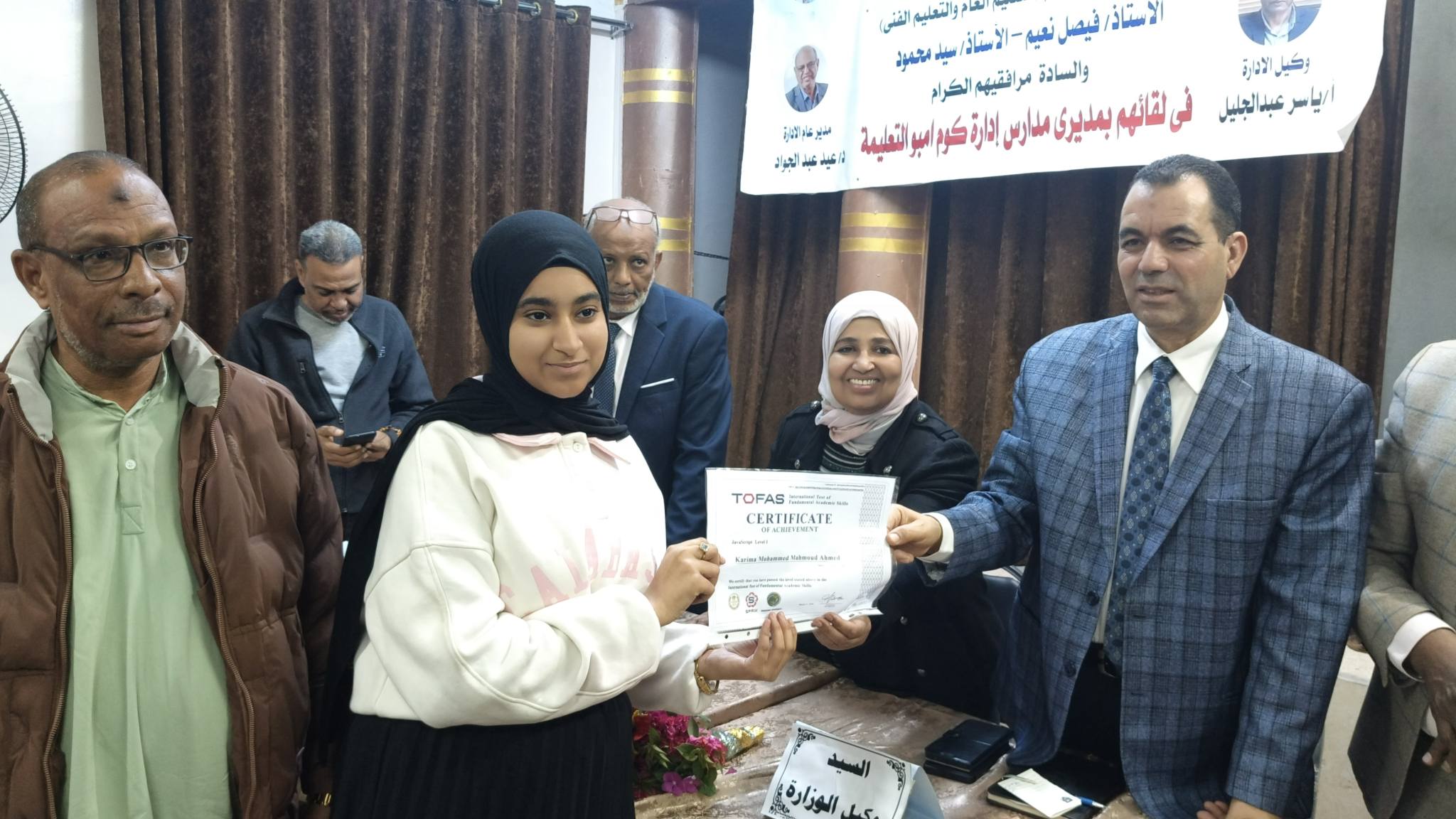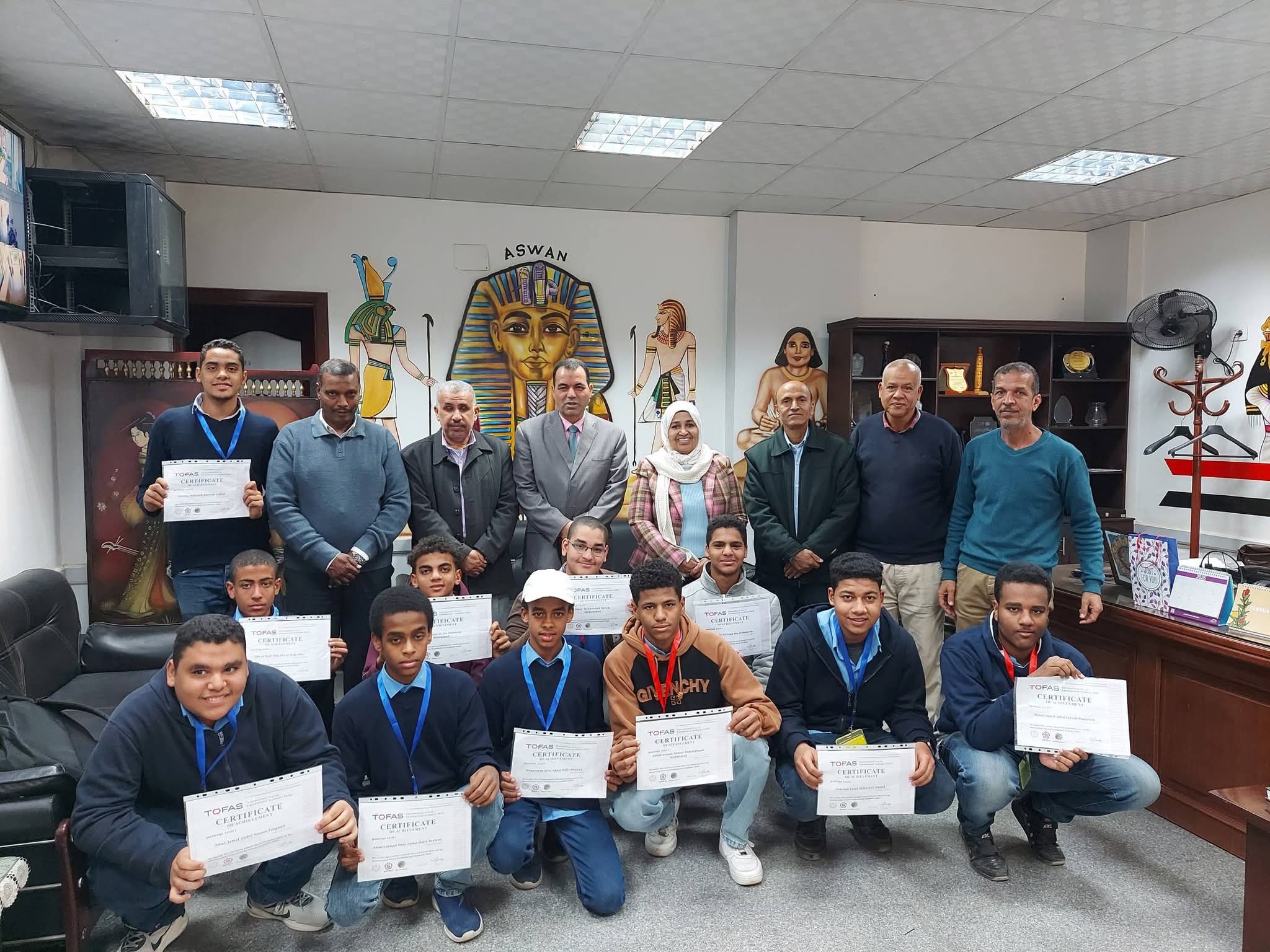 تكريم د/ربيع أبو يوسف وكيل وزارة التربية والتعليم بأسوان، لطلاب الصف الأول الثانوى الحاصلين على شهادة البرمجة (TOFAS)، بمدارس (الشهيد محمد خالد الثانوية بنين- ابراهيم بشير الثانوية بنات- أحمد محمد موسى الثانوية بنات - كرم الديب الثانوية المشتركة- أحمد مرعى بسلوا بحرى -سلوا قبلى الثانوية- القهمورى للغات)، التابعة لإدارة كوم امبو التعليمية. بحضور وكيل المديرية والسادة مديرى وموجهى عموم المواد الدراسية ووالقيادات التعليمية ومديرى المدارس بكوم امبو .