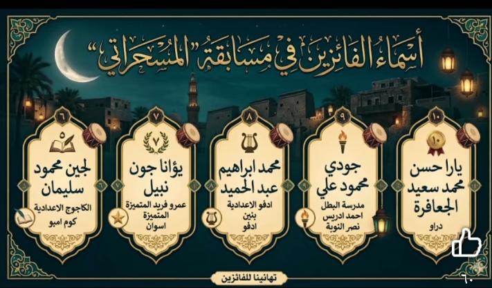 في تكريم وإنجاز جديد لإدارة ادفو التعليمية بالدعم المباشر من السيد الدكتور ربيع ابو يوسف وكيل وزارة التربية والتعليم بمحافظة أسوان بعد إعلانه عن المسابقات المسحراتي - قاهرة المعز - قطوف تطوف وتشوف علي صفحة بوابة أسوان التعليمية وكان من ضمن الفائزين لإدارة ادفو التعليمية الطلاب :- ١-محمد حامد محمد بمدرسه المملحة الابتدائية. ٢- محمد ابوبكر عبدالحارث بمدرسة حاجر السباعية غرب الابتدائية. ٣- ريتاج محمد محمد حامد بمدرسة ملحقة ام المؤمنين الإعدادية بنات . ٤- جمال عصام علي بمجمع اللغات ادفو. ٥- محمد ابراهيم عبدالحميد بمدرسة ادفو الإعدادية الحديثة بنين.